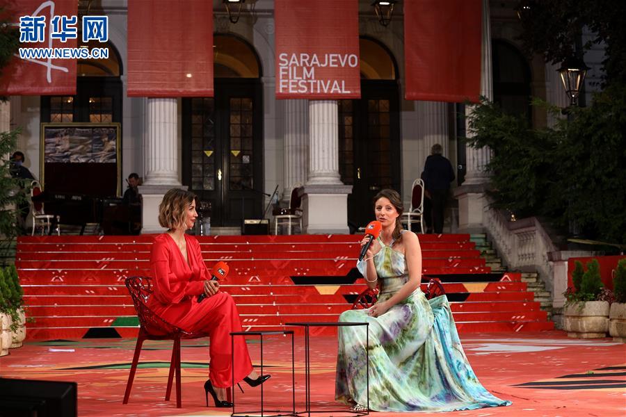 8月14日,在波黑萨拉热窝,一名参加电影节的演员(右)接受媒体采访。 第26届萨拉热窝电影节14日晚开幕。受新冠疫情影响,本届电影节全程在线举行。 新华社发(内迪姆·格拉博维察摄)