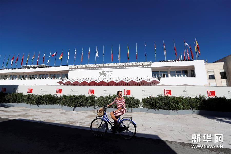 9月1日,一名女子骑车经过意大利威尼斯利多岛上的电影宫。新华社/路透