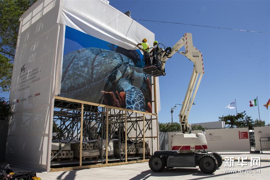 9月1日,工作人员在意大利威尼斯利多岛为第77届威尼斯电影节开幕做最后准备。新华社/美联