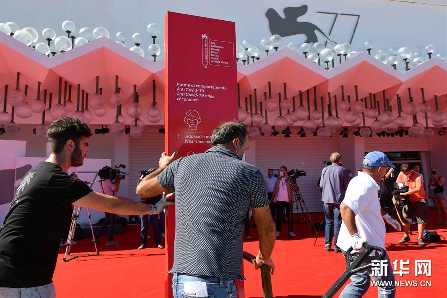 9月1日,工作人员在意大利威尼斯利多岛为第77届威尼斯电影节开幕做最后准备。新华社/法新