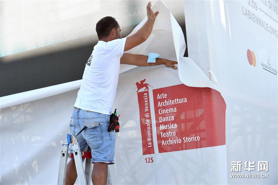 9月1日,一名工作人员在意大利威尼斯利多岛为第77届威尼斯电影节开幕做最后准备。新华社/西霸