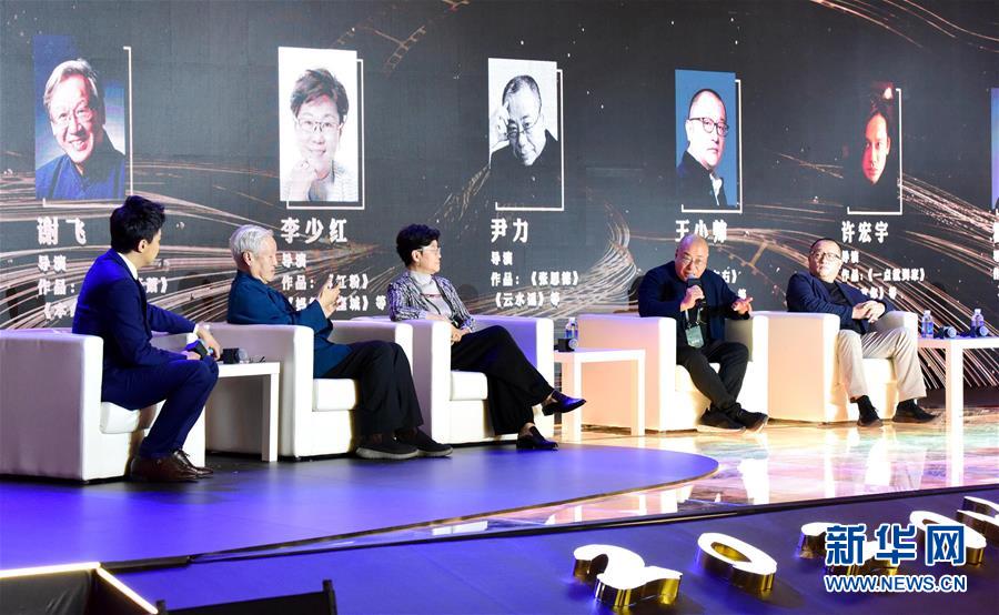9月24日,导演尹力(右二)在论坛上发言。 9月24日至26日,2020年中国金鸡百花电影节暨第35届大众电影百花奖在郑州举办。24日,电影节举行开幕论坛。 新华社记者 朱祥 摄