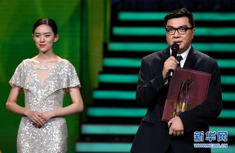 9月25日,获最佳导演提名的导演陈国辉(右)在表彰仪式上发表感言。 当日,第35届大众电影百花奖提名者表彰仪式在河南郑州举行。仪式上,获得最佳影片、最佳男主角、最佳女主角、最佳导演等奖项提名的电影作品和电影人受到表彰。 新华社记者 李安 摄