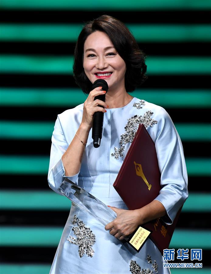 9月25日,获最佳女主角提名的演员惠英红在表彰仪式上发表感言。 当日,第35届大众电影百花奖提名者表彰仪式在河南郑州举行。仪式上,获得最佳影片、最佳男主角、最佳女主角、最佳导演等奖项提名的电影作品和电影人受到表彰。 新华社记者 李安 摄