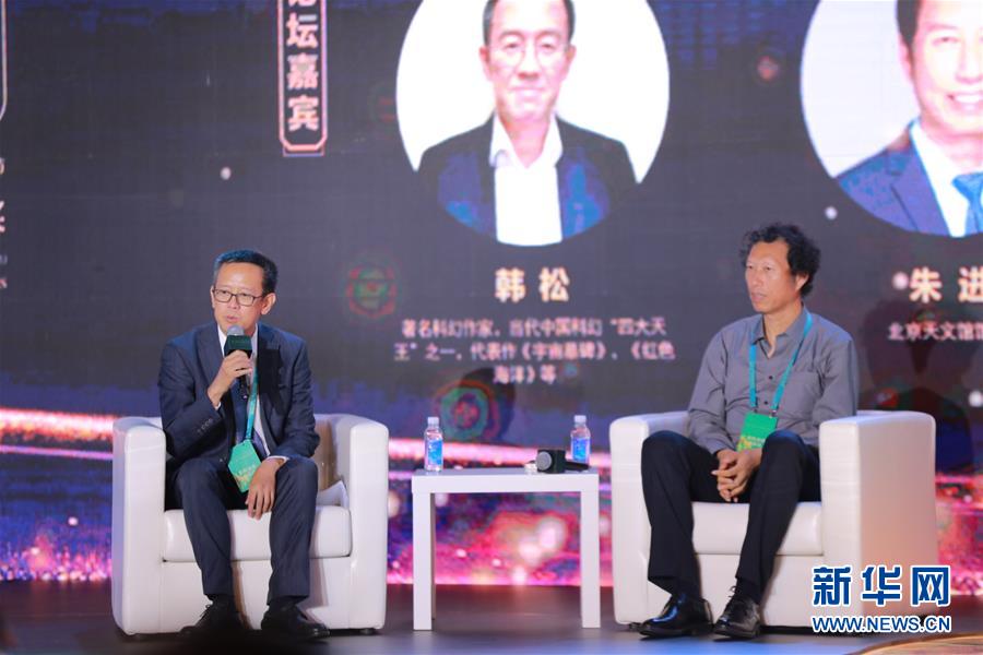 9月26日,科幻作家韩松(左)在郑州举行的中国科幻电影创作高峰论坛上发言。 新华社记者 任沁沁 摄