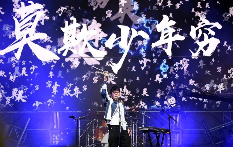 11月1日晚,九连真人乐队副主唱阿麦在西安草莓音乐节上表演。 当日,2020西安草莓音乐节在西安大明宫国家遗址公园闭幕,20组乐队和音乐人在为期两天的音乐节上为广大乐迷献上了精彩纷呈的演出。 新华社记者 李一博 摄