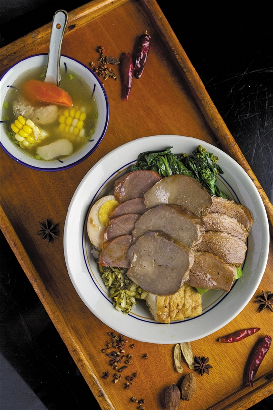 Franco表示,要做到这种效果,对于香料的选择尤其注重,像桂皮指定用越南产的,花椒则必须用攀枝花的,南姜需是个头小但香味足的潮洲姜。卤水的底汤用鸡架、鹅肉、大猪骨以及纯鹅油煲制,每日下班后,厨师都会对其进行隔渣,同时加入新鲜香料,以确保它的味道始终如一。