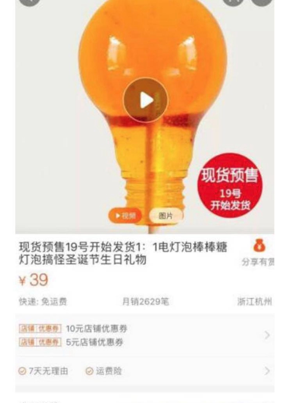 记者仔细浏览多个商家的页面信息后发现,不少卖家都打上"1:1定制"的字样,即和正常电灯泡大小基本一致:灯泡糖直径约6厘米,长度约10厘米。此外,商家的广告还显示,灯泡糖是纯手工熬制,在预售中,为了促销,部分商家甚至打出“工厂大量生产,尽情下单”来吸引消费者。