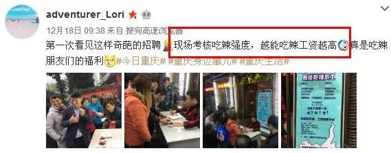 近日,重庆网友“@adventurer_lori”在微博中晒出了一组“吃辣招聘”照片,并提到:“第一次看见这样奇葩的招聘,现场考核吃辣强度,越能吃辣工资越高,真是吃辣朋友们的福利。”