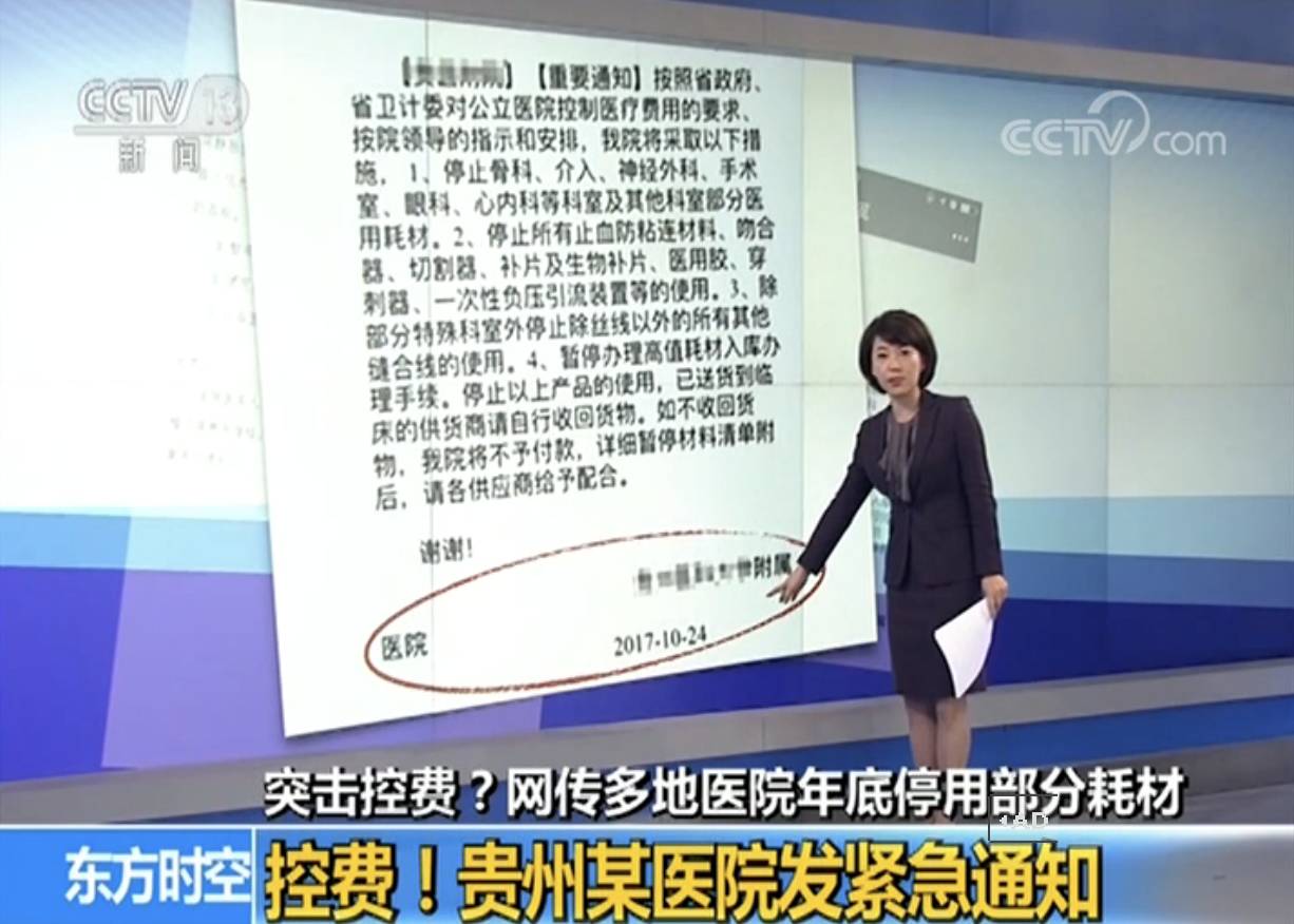 这条“紧急通知”落款单位是某附属医院,医院的名称被打上了马赛克,发布日期显示10月24日。有网友认定,这则通知出自贵州医科大学附属医院。通知中称,按照省政府、省卫计委对公立医院控费的要求,今后将采取“停止骨科、介入、神经外科、手术室、眼科、心内科等科室及其他科室部分医用耗材”。