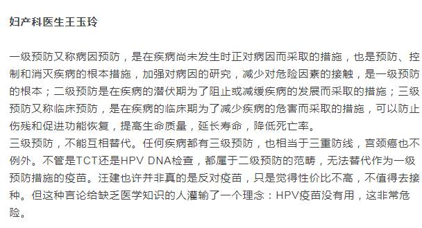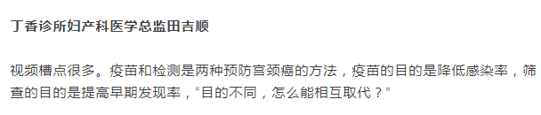 汪健的这番宫颈癌疫苗言论引起轩然大波,行业专家学者对此基本持反对观点,多数认为,预防与治疗是疾病的两个不同阶段,将两者混为一谈,认为检测可以替代预防,并不负责任。