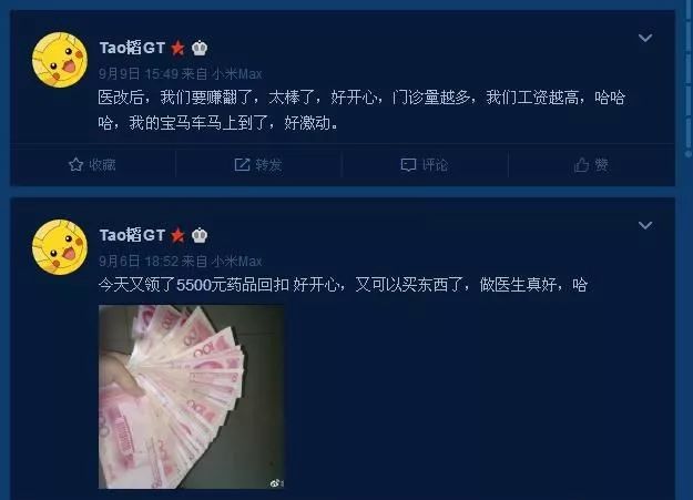 在发布于9月6日18时52分的这则微博中,@TAO韬GT晒出一张手抓呈扇形展开数十张百元大钞的照片,并配文称:今天又领到了5500元药品回扣 好开心,又可以买东西了,做医生真好,哈