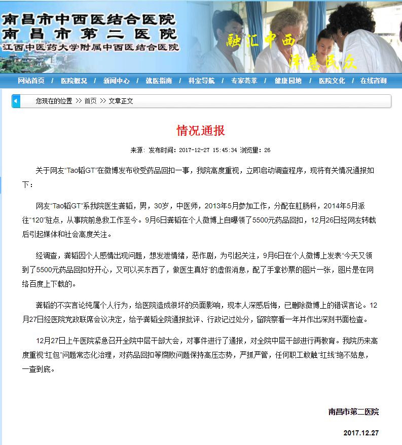 27日,南昌市第二医院在其官方网站上作出情况通报,龚韬的不实言论纯属个人行为,给医院造成很坏的负面影响,现本人深感后悔,已删除微博上的错误言论。经医院党政联席会议决定,给予龚韬全院通报批评、行政记过处分,留院察看一年并作出深刻书面检查。