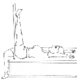 做法:坐在床尾,臀部尽量移至床尾立杆处,身体以仰卧姿态躺下;右腿伸直靠在立杆上,臀部贴紧立杆,左脚落地尽可能触及地面。