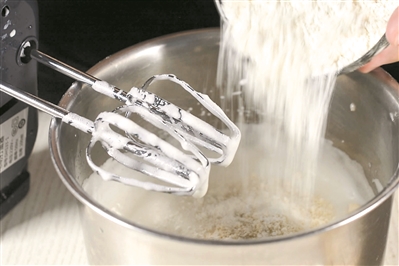 1.将少许柠檬汁加入到蛋清中,再分次加入糖粉,将蛋清打发,再把蜂蜜倒入蛋清中,打发成大的气泡。