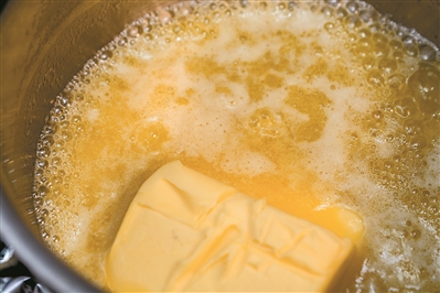 3.黄油入锅加热,边加热边用耐热刮刀轻轻搅拌,煮至黄油变成淡褐色后,立即连锅放进冷水里,冷却至微温,即成焦化黄油。