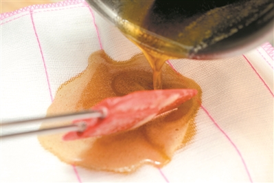1 煮制黄油至焦黄色泽是非常关键的一步,这样才能做出金灿灿的、边缘焦脆浓香的费南雪。在加热黄油过程中,需时刻用小勺捞起黄油察看颜色,煮至黄油淡褐色后,立即将小锅浸入冷水中降温。