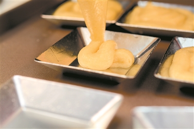 5.先在模具中均匀刷上一层油,然后将面糊用裱花袋挤进模具里,至八分满即可。