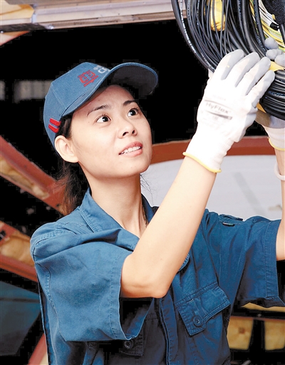 每根线缆有一个6位数线号。“450103.02”,拿着PIS柜接线表上标注的线号,李颖仔细寻找。为缩小设备占用空间,动车组上很多控制柜放在一起。李颖先要将自己需要的线缆在一大堆线束中精确找出来。“第一次上岗分线花了两天,现在半天就行了。”她清秀的面容上带着微笑。