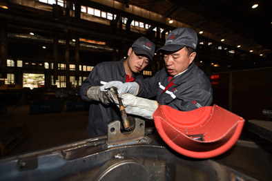 ▲4月22日,李万君(右)手把手向徒弟郭松传授动车组转向架的焊接要领。新华社记者张楠摄