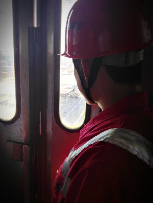 (站在电梯里的张彦默默注视着洋山港区 张冀北 摄)