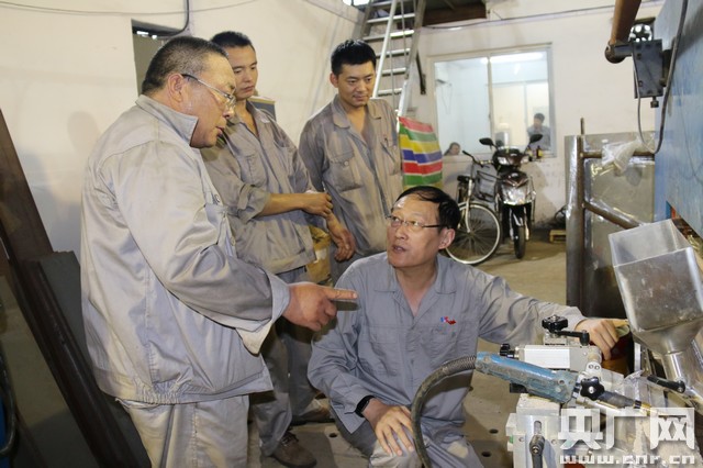 与徒弟们研究自动化机械焊接设备(王晶 摄)