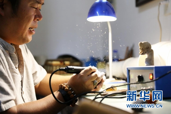 新华网北京9月29日电(记者 李旭)一把雕刻刀、一颗琥珀,他在工作室里专心于创作。80后的他身量微胖,声音洪亮,坐在记者对面手拿雕刻刀在琥珀上雕刻纹样,厚薄有度,刚柔相济,精致的纹案慢慢显现出来。每一块琥珀都是大自然的精灵,而琥珀雕刻的背后凝聚着中国匠人的坚守、热枕和执着。