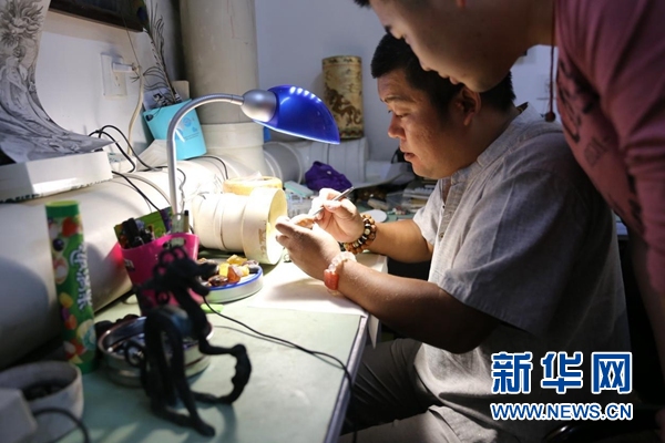 陈焕升向徒弟传授琥珀雕刻技巧(李旭摄)