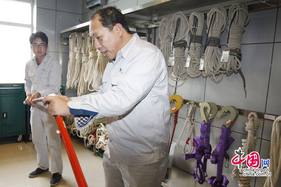 赵文武平时严格执行工作要求,定期对工具进行检查,确保每一步的安全。他说:“我的原则就是要保证大家的安全,确保零事故。”图为赵文武在调试直线拉杆。中国网记者 李佳摄影