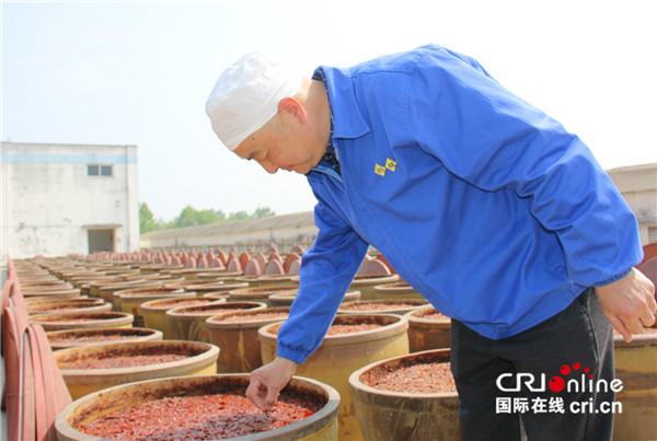 张安秋在晾晒场检查正在晒制的豆瓣 摄影:黎萌