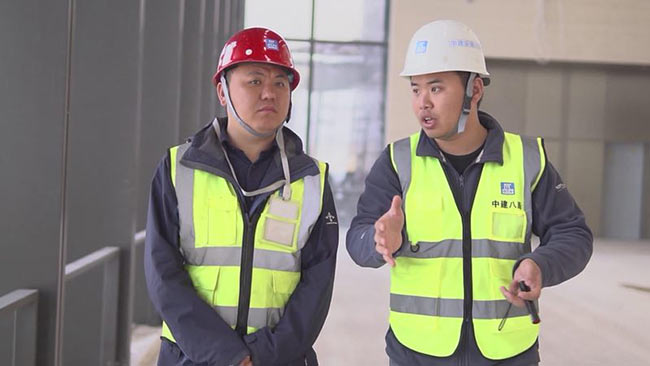 (左一)为中建安装青岛心海广场机电安装工程项目经理陈刚