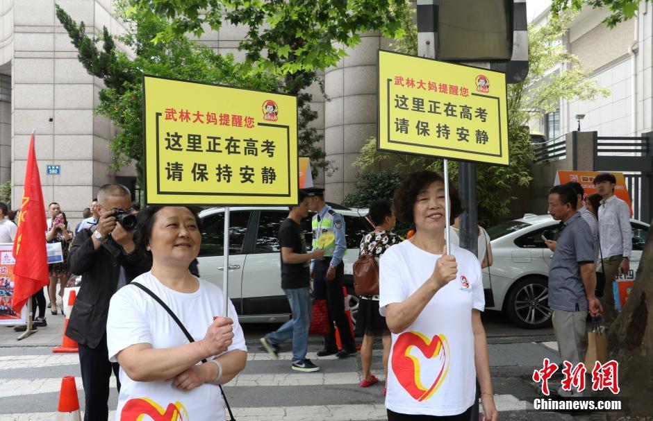 6月7日,高考第一天。记者来到浙江省杭州市第十四中学。考场外,不仅有很多家长在校门口等候,还有热心的杭州“武林大妈”为学生及家长提供爱心助考服务。图为杭州“武林大妈”提醒路人保持安静。 王刚 摄 记者 张茵
