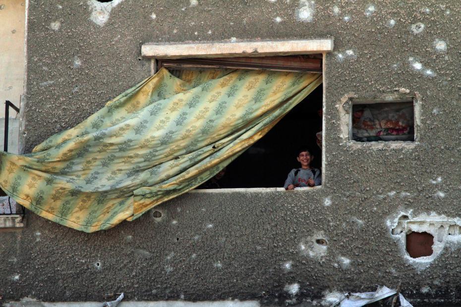 2018年4月20日,在叙利亚大马士革东郊杜马镇,一名男孩从自家窗户探出头来。新华社发(胡马姆·阿里摄) 图片来源:新华网