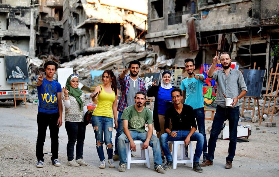 2018年8月16日,年轻画家们在叙利亚首都大马士革的耶尔穆克难民营废墟前合影。新华社发(阿马尔摄) 图片来源:新华网
