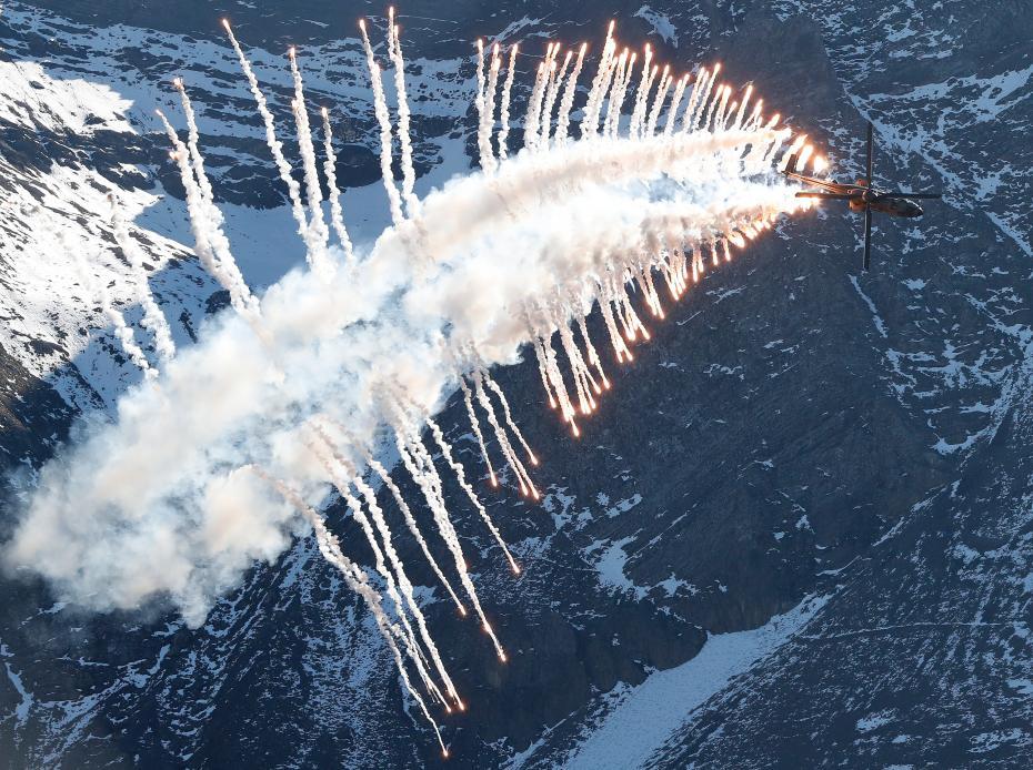 2018年10月10日,在瑞士迈林根空军基地附近,瑞士空军直升机进行飞行表演。新华社发(鲁本·斯布里奇摄) 图片来源:新华网