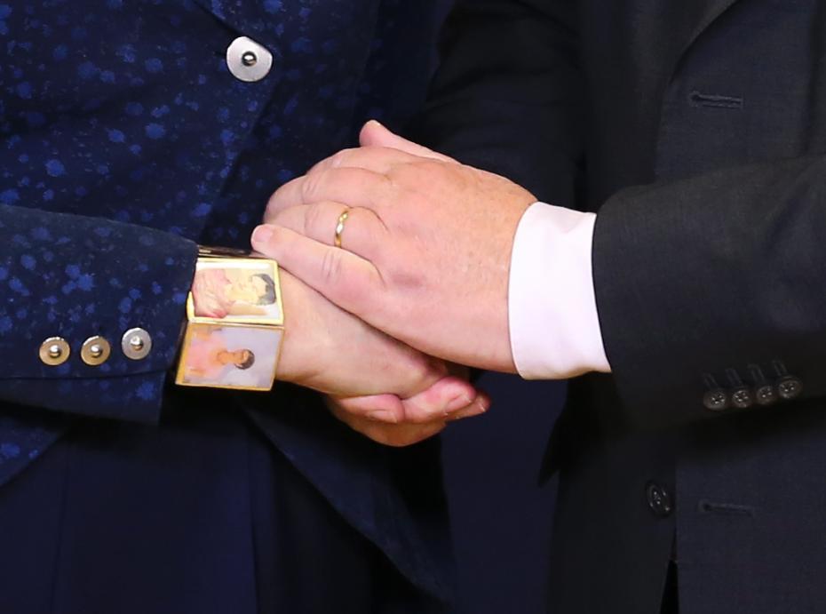 2018年11月25日,在比利时布鲁塞尔,欧盟委员会主席容克(右)与英国首相特雷莎·梅握手。当日,欧盟成员国领导人正式通过此前与英国达成的“脱欧”协议。新华社记者叶平凡摄 图片来源:新华网