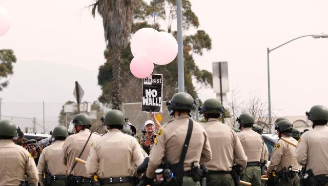 2018年3月13日,在美国加利福尼亚州圣迭戈市,一名男子在重重警戒中抗议设立美墨边境墙。当日,美国总统特朗普视察了位于该地的边境“样板墙”。新华社记者 李颖 摄 图片来源:新华网