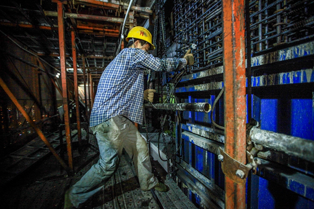 37岁的张志礼来自湖北十堰,在顶升工作中负责绑模板的工作,保障顶升工作的安全进行。