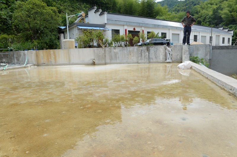 2017年5月19日,安徽宣城,曹移程家门前的污水处理池边,一位村民在仔细查看。最近县里环保要求越来越严,村民们越来越重视造纸带来的水污染问题。