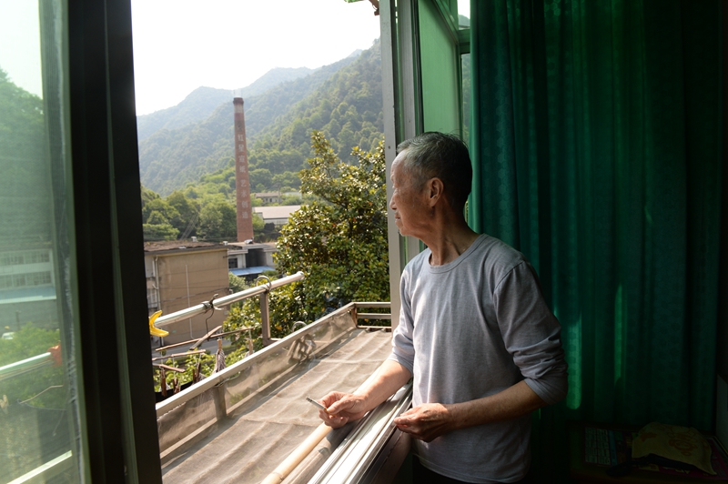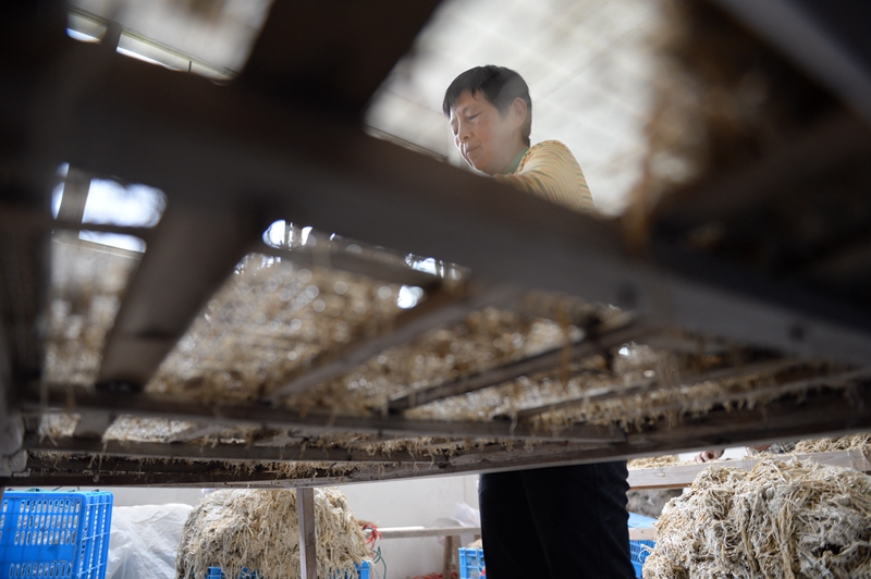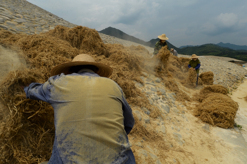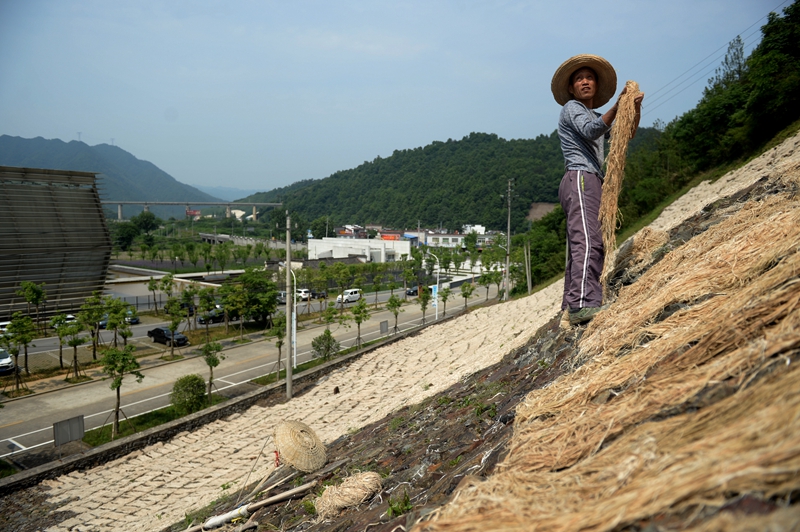 2017年5月22日中午,安徽宣城。54岁的赵西华仍在石坡上晾晒古法宣纸制造的青檀皮。经过漫长的日晒雨淋后,容易产生质变和虫蛀的木质素才会逐渐褪去,宣纸才有了柔韧防蛀的品质。