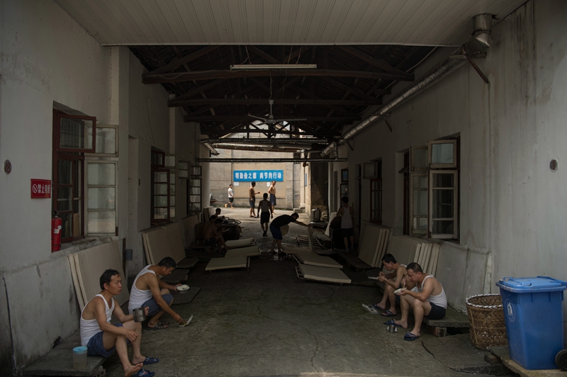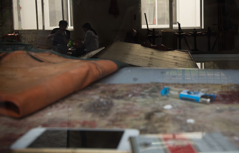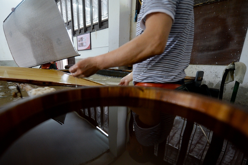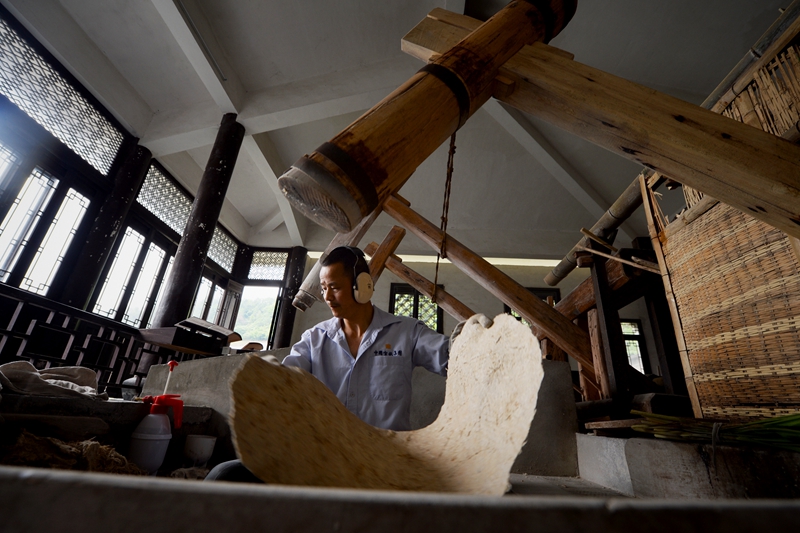 2017年5月21日,安徽宣城。中国宣纸文化园内,一名工人正在加紧作业。文化园建立于2007年,由当时的中国宣纸集团投资成立。针对宣纸制造这项非遗进行生产性保护是一项系统工程,文化园也在不断完善。