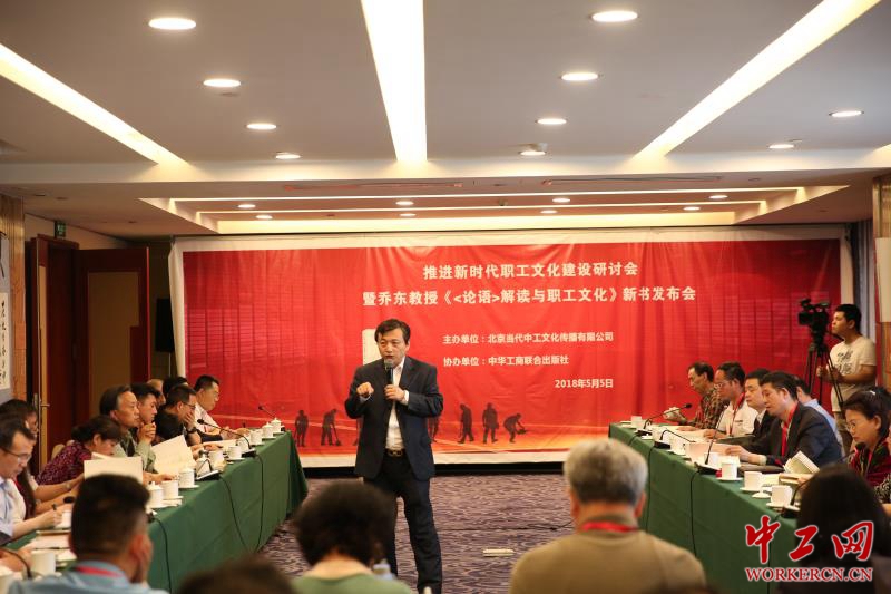 2018年5月5日,推进新时代职工文化建设研讨会暨乔东教授《<论语>解读与职工文化》新书发布会,在中国职工之家成功举行。中华全国总工会宣教部原副部长王成,国务院国资委研究中心研究员张喜亮,大国工匠高凤林,全国劳模、内蒙古自治区总工会兼职副主席郑贵有,中煤地质工程有限公司董事长林中湘,国家电网工会宣教文体部部长王宏斌,国图集团党委副书记、工会主席成德,中铁二局华北公司副总经理、工会主席冯金平,中国新兴建筑工程有限责任公司纪委书记、工会主席张扬,国华北京热电公司原党委书记李玉良,《班组天地》杂志副主编刘滢出席会议。来自中国劳动关系学院劳模本科班的学员代表、高校、地方工会、中央企业、民营企业的全国劳模、大国工匠、专家学者、工会干部和企业领导70余人参加了会议。开幕式由北京责任文化研究院院长唐渊主持。