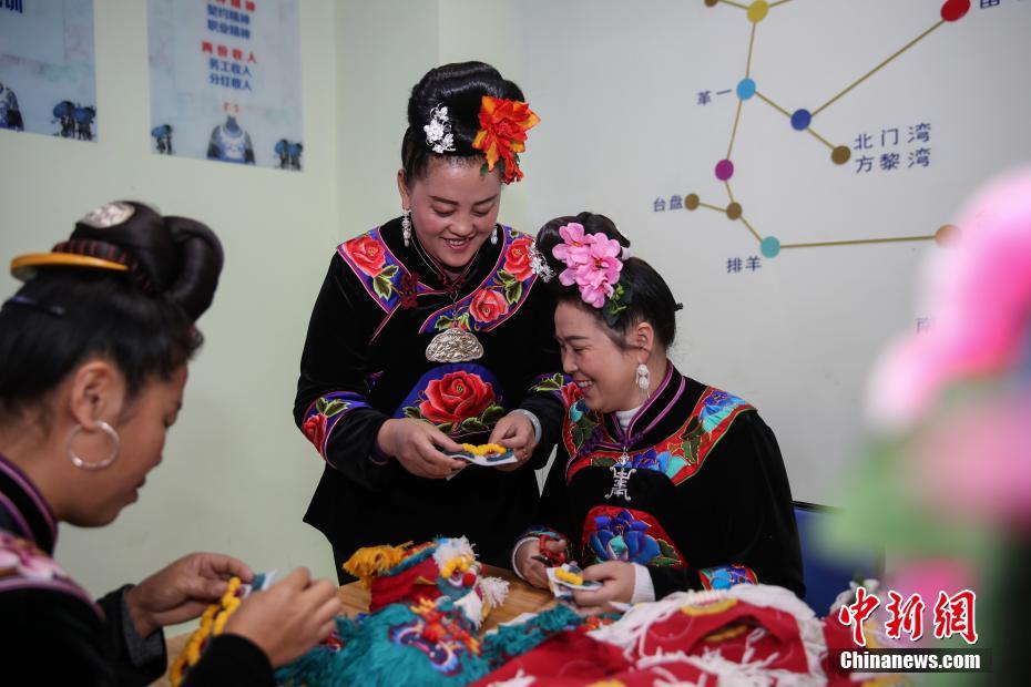 10月20日,扶贫工坊技术负责人(左二)指导绣娘创作。当日,在贵州省黔东南苗族侗族自治州台江县方黎湾社区,20余名苗族绣娘在“妈妈制造”台江苗手工扶贫工坊绣制苗绣订单产品供应市场。台江县是贵州省“锦绣计划巧手脱贫示范县“,于2019年开始实施“妈妈制造”产业帮扶项目,通过设计支持、品牌推广等举措帮助贫困妇女就业脱贫。目前全县已建立扶贫工坊14个,带动了万余名绣娘携手致富。中新社记者 瞿宏伦 摄
