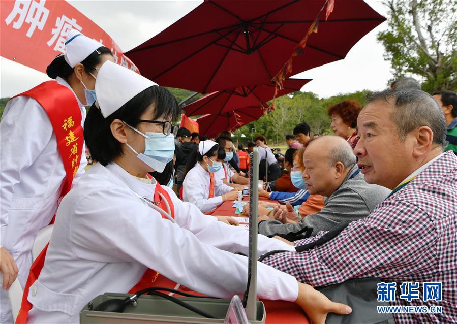 10月20日,福建省肿瘤医院青年志愿者在现场免费为社区群众测量血压。 当日,福建省福州市晋安区在福州市牛岗山公园举办新时代文明实践志愿服务活动。在“公益集市”志愿服务现场,参加活动的近百名青年志愿者免费为社区群众提供测量血压、心肺复苏教学、网络安全教育、政策咨询和互动游戏等志愿服务。2019年10月,福州市晋安区被确定为全国第二批新时代文明实践中心建设试点区。 新华社记者 魏培全 摄