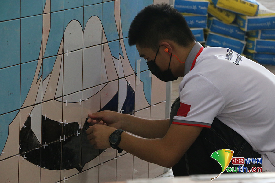 接下来又要面对电锯被禁用的困境,不得已,崔兆举只能用手锯,比赛时对切割精度要求很高,时不时会碰到像小拇指指甲盖这么大小的瓷砖需要切割,这也使得他的进度相比较练习时慢了一些。好在崔兆举在第二天及时调整好了,第三天、第四天发挥得很好。