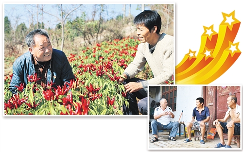 上图 张东堂(左)在贫困户家的辣椒地里查看辣椒长势。右图 张东堂(左一)来到贫困户家中家访。 郭静原摄