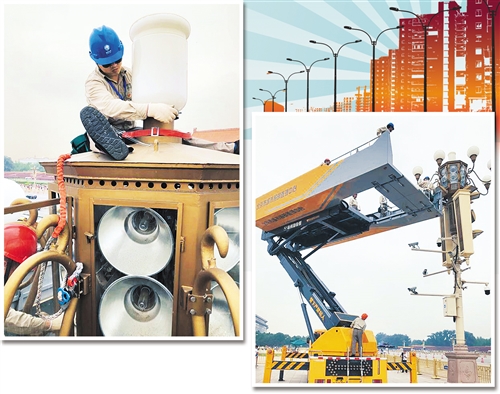 每年5月份到9月份,是北京最炎热的季节,也是华灯班最忙碌的时候。为了每年国庆节期间华灯能够以最好的状态向世人展示,这个北京最难熬的几个月华灯班要对253基华灯、6000多个灯球做全方位的清洗检修。同时,还要对华灯的光源、线路、镇流器、保险等核对、记录,为日常运行维护工作提供详实依据。