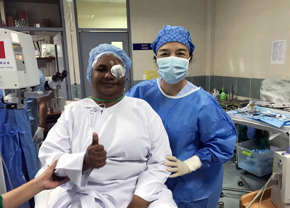 通过充分评估,为了满足老人有生之年再看看子孙的念想,陈伟蓉带着中国医生的自信和精湛医术,为老人施行了手术。术后第二天,老人重见光明。