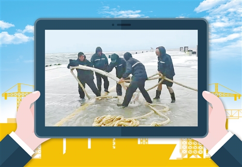 到达平台停泊点,这12名勇士分别在不同部位拼力作业,用一根根缆绳加固着平台,让平台慢慢稳定下来。然而,就在处于码头最边沿的黄群、姜开斌紧张作业之际,身后一个巨浪突然袭来,瞬间将他俩卷入海中。其他同志在震惊之余,立刻开始了全力营救。