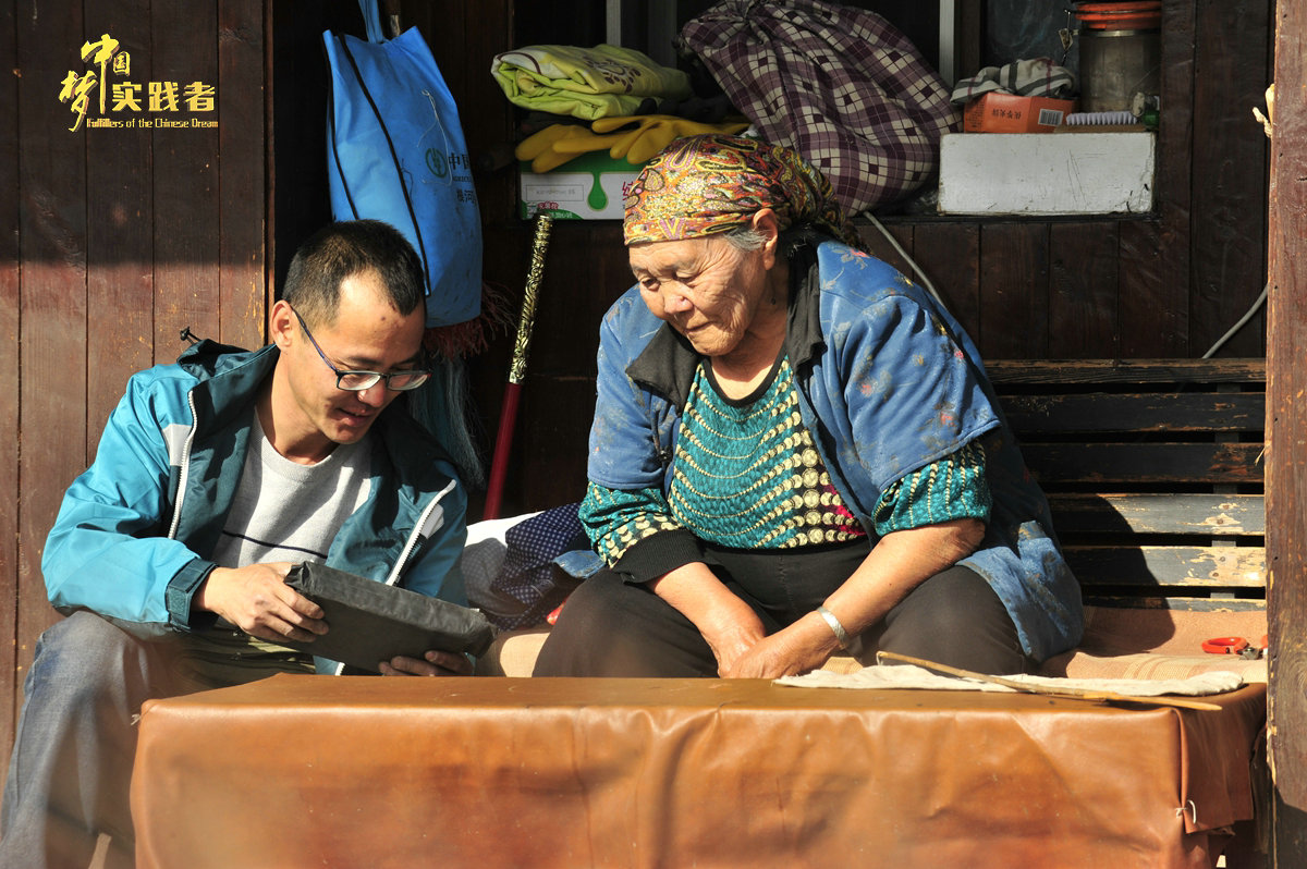 在内蒙古根河市敖鲁古雅乡,韩天虎在鄂温克族大娘安塔布家中,为老人阅读包裹上的邮寄人信息。